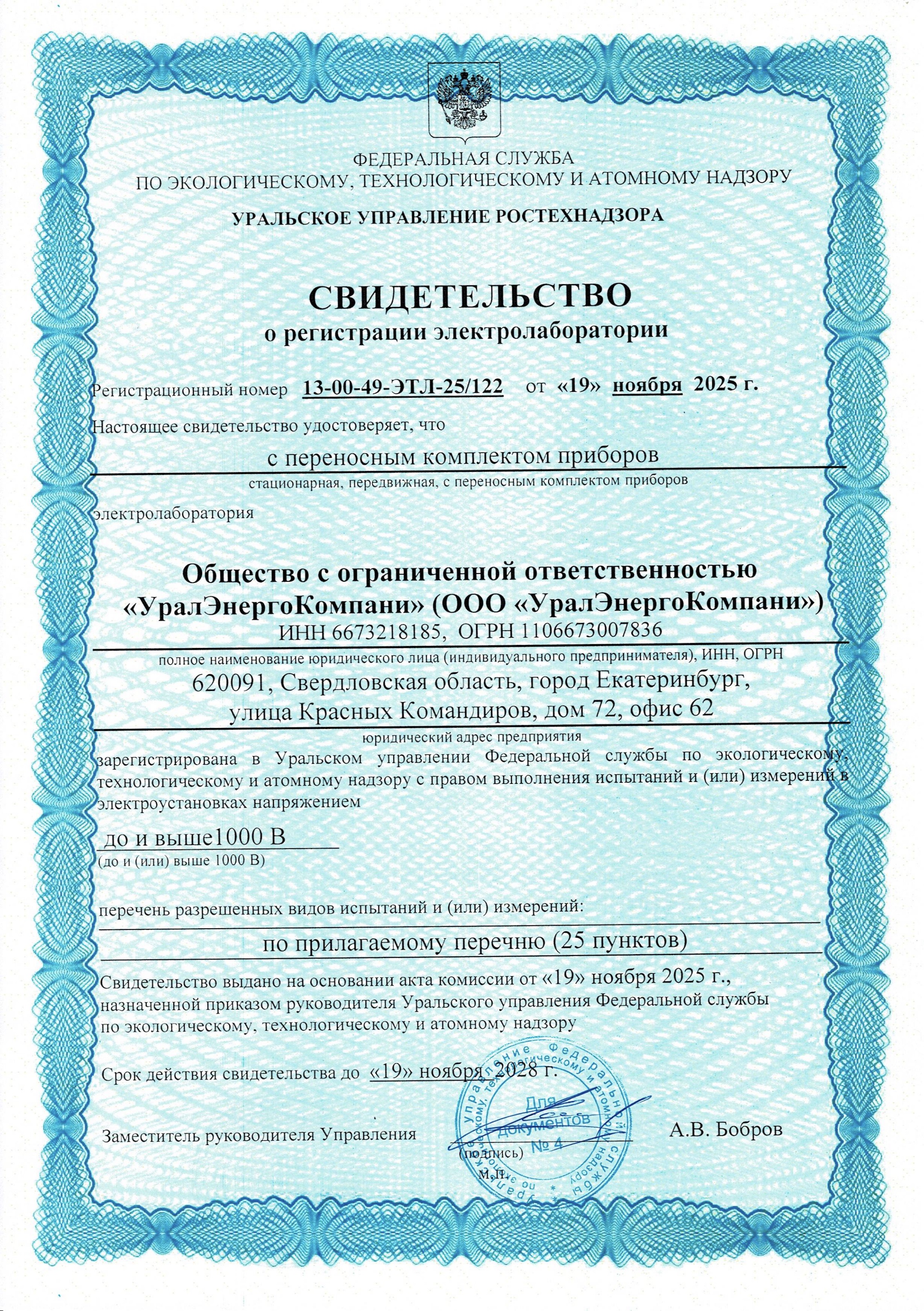 Срок действия «Свидетельства о регистрации электролаборатории» до 19.11.2028 г.